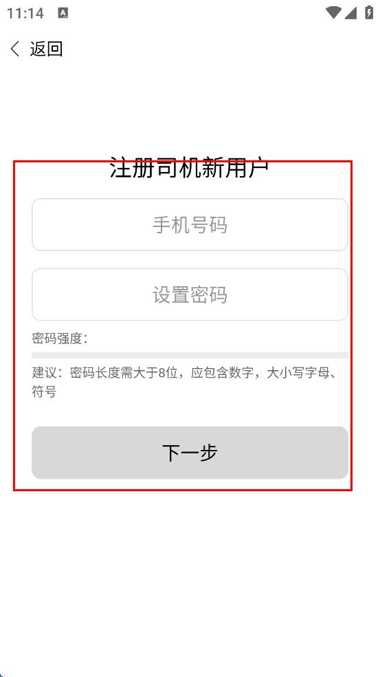 4、在注冊司機新用戶頁面,輸入手機號碼,設置符合要求的密碼,點擊“下一步”,按提示完成后續(xù)注冊流程,再進行登錄。