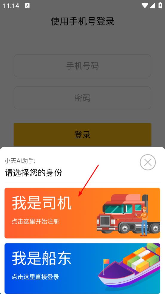 3、在身份選擇界面,選擇“我是司機”,進入注冊司機新用戶頁面。