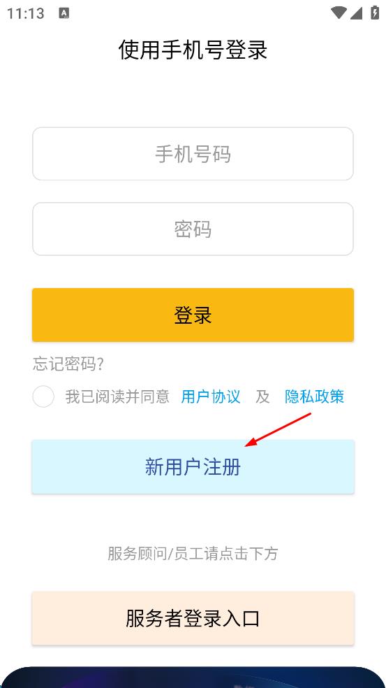 2、在使用手機號登錄頁面,點擊“新用戶注冊”,彈出身份選擇界面。