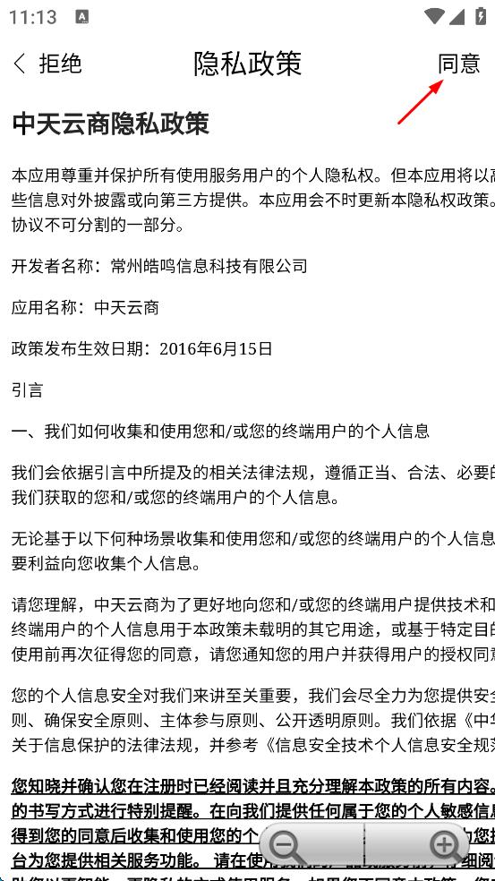 1、打開中天云商,會出現(xiàn)隱私政策界面,仔細閱讀后點擊“同意”,進入使用手機號登錄頁面。