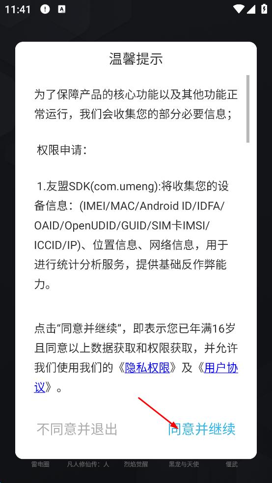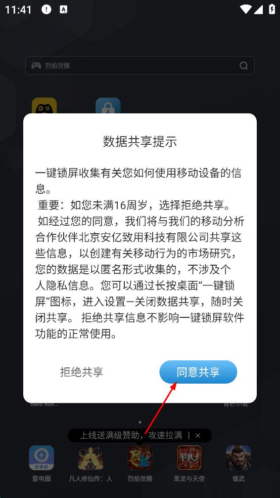 1、打開一鍵鎖屏APP,在溫馨提示彈窗中點擊同意并繼續(xù)。