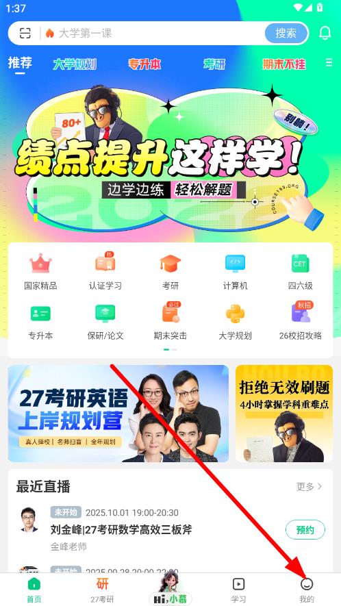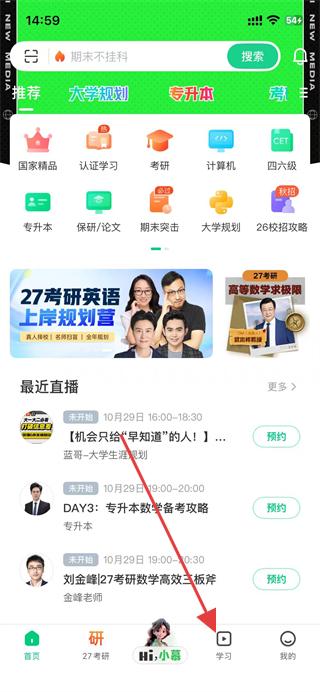 1、打開慕課app,點(diǎn)擊底部導(dǎo)航欄的學(xué)習(xí)選項(xiàng)。