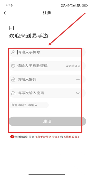 4、在注冊頁面依次輸入手機號、手機驗證碼、密碼、再次輸入密碼后,點擊“注冊”,完成賬號注冊操作。