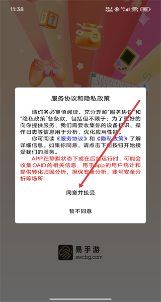 1、點擊“服務協(xié)議和隱私政策”彈窗的“同意并接受”,進入易手游首頁。