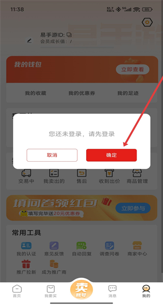 2、在我的主頁中彈出未登錄提示彈窗后點擊“確定”,進入登錄界面。
