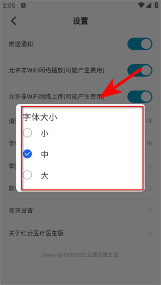 4、在彈出的字體大小選擇框中,選擇小、中或大,完成設(shè)置。