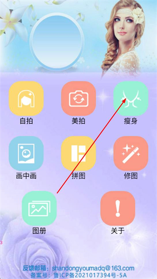 1、打開顏甜相機(jī)APP,點(diǎn)擊瘦身功能選項(xiàng),進(jìn)入瘦身操作流程。