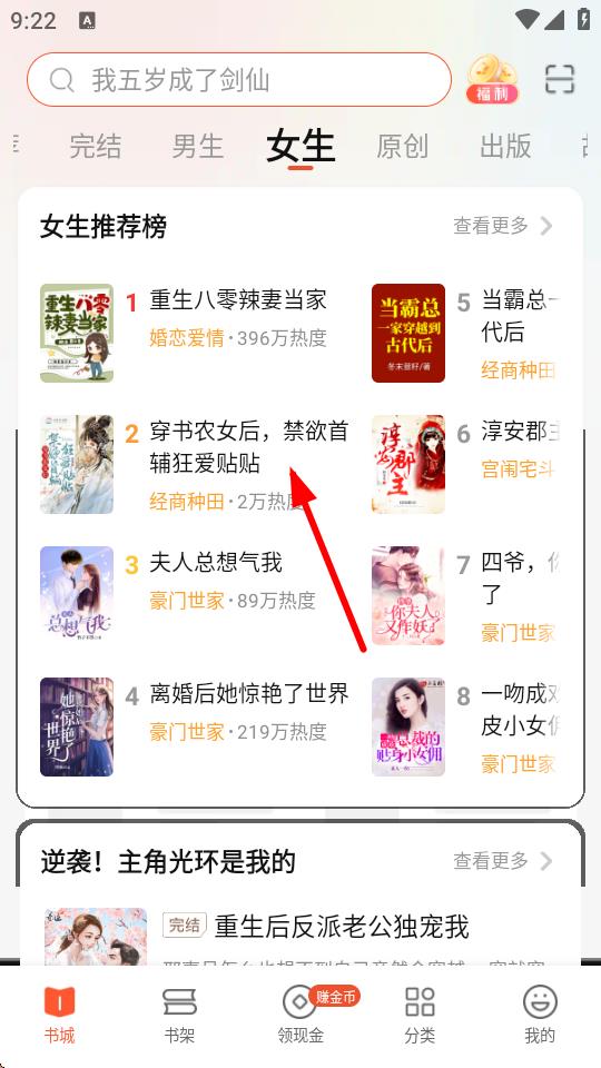 2、在書(shū)城頁(yè)面的女生推薦榜里,點(diǎn)擊想要查看目錄的小說(shuō),比如穿書(shū)農(nóng)女后,禁欲首輔狂愛(ài)貼貼。