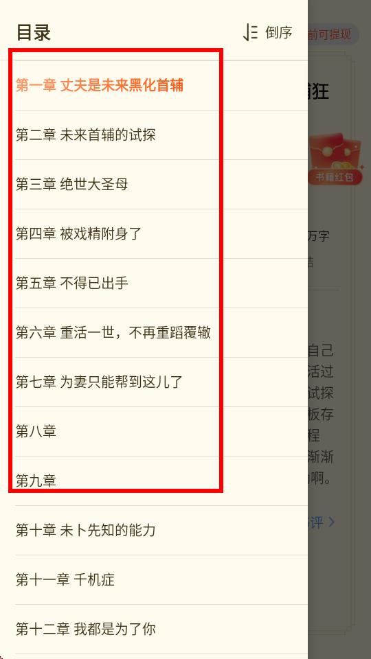 4、此時(shí)會(huì)彈出小說(shuō)的目錄列表,在列表中可以查看各章節(jié)內(nèi)容,方便選擇章節(jié)閱讀。