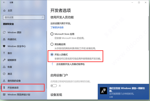 6.點(diǎn)擊左側(cè)開發(fā)者選項(xiàng),選擇右側(cè)開發(fā)人員模式,系統(tǒng)會(huì)自動(dòng)安裝功能