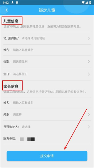 3、填寫兒童信息和家長(zhǎng)信息,點(diǎn)擊提交申請(qǐng),完成兒童綁定。