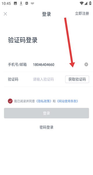 4、在登錄頁面輸入手機號后,點擊“獲取驗證碼”,輸入收到的驗證碼后完成賬號登錄操作。