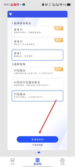1、打開光速虛擬機(jī)APP,選擇界面選擇安卓版本和架構(gòu),點(diǎn)擊新建虛擬機(jī)。