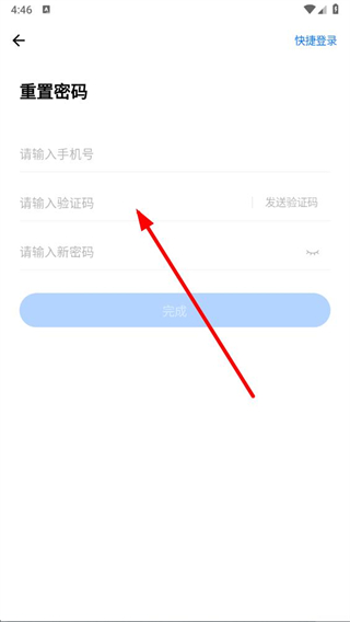 3、在重置密碼界面,輸入手機(jī)號(hào),點(diǎn)擊發(fā)送驗(yàn)證碼,輸入收到的驗(yàn)證碼和新密碼后點(diǎn)擊完成,即可重置密碼。