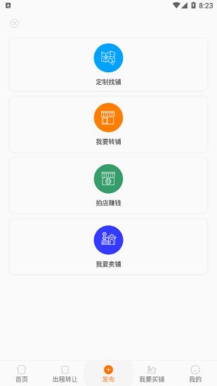 發(fā)布:定制找鋪、我要轉(zhuǎn)鋪、我要賣鋪、拍店信息發(fā)布