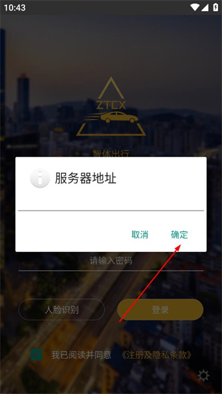1、進(jìn)入智體出行界面,出現(xiàn)服務(wù)器地址彈窗,點(diǎn)擊確定按鈕關(guān)閉彈窗,進(jìn)入登錄選擇頁(yè)面。