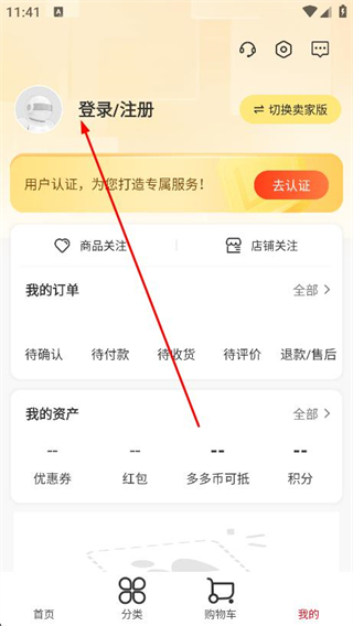 2、在我的頁面,找到并點(diǎn)擊上方登錄/注冊區(qū)域。