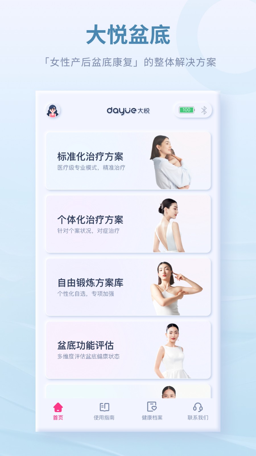 大悅盆底App全新上線(xiàn),為您提供盆底功能評(píng)估、標(biāo)準(zhǔn)化治療方案、個(gè)體化治療方案、自由鍛煉方案庫(kù)、健康檔案等功能。