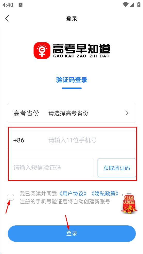 4、選擇高考省份,輸入手機號碼,獲取驗證碼,填入驗證碼,勾選同意相關協(xié)議,點擊“登錄”按鈕完成登錄。