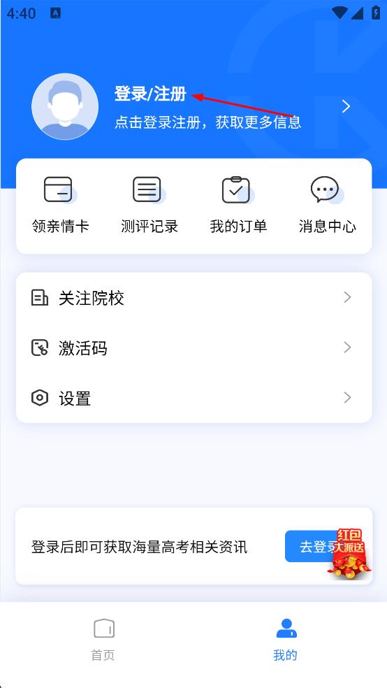 3、在個人相關頁面,點擊“登錄/注冊”選項,進入登錄界面。