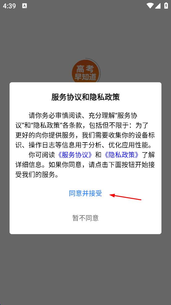 1、打開高考早知道APP,彈出服務協(xié)議和隱私政策窗口,閱讀后點擊“同意并接受”按鈕,進入APP主界面。