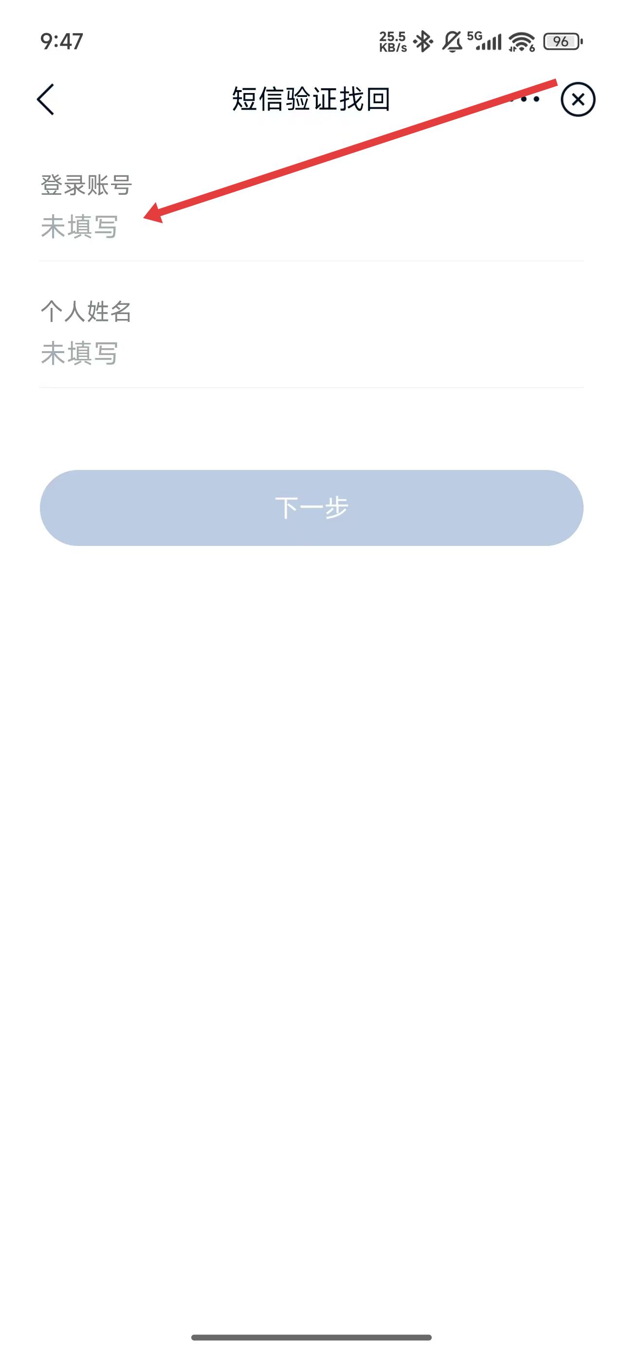 4、在進(jìn)入到短信驗(yàn)證找回頁(yè)面時(shí),點(diǎn)擊輸入框依次填寫(xiě)賬號(hào)和個(gè)人姓名后完成找回操作。