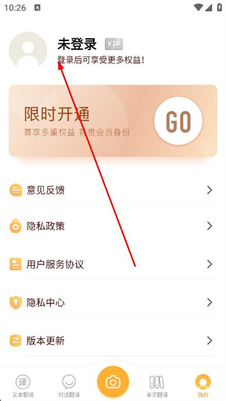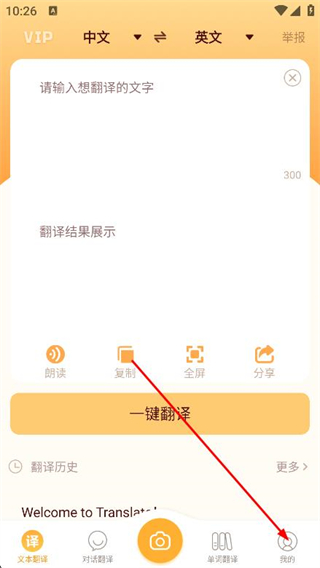 1、打開英文拍照翻譯app,找到并點擊底部導(dǎo)航欄最右側(cè)的我的選項。