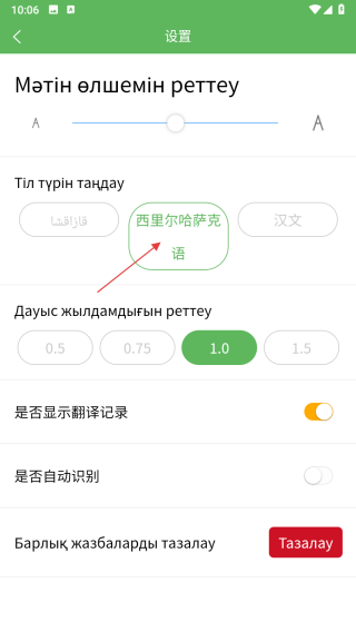 4、根據(jù)自身需求點擊想要切換的語言選項,像點擊西里爾哈薩克語,就能完成哈漢翻譯通的語言設置切換。