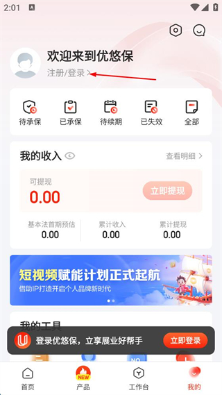 2、在我的頁(yè)面,點(diǎn)擊注冊(cè)/登錄。