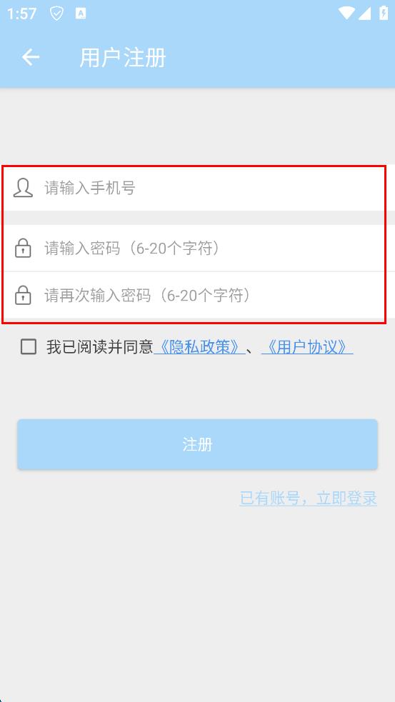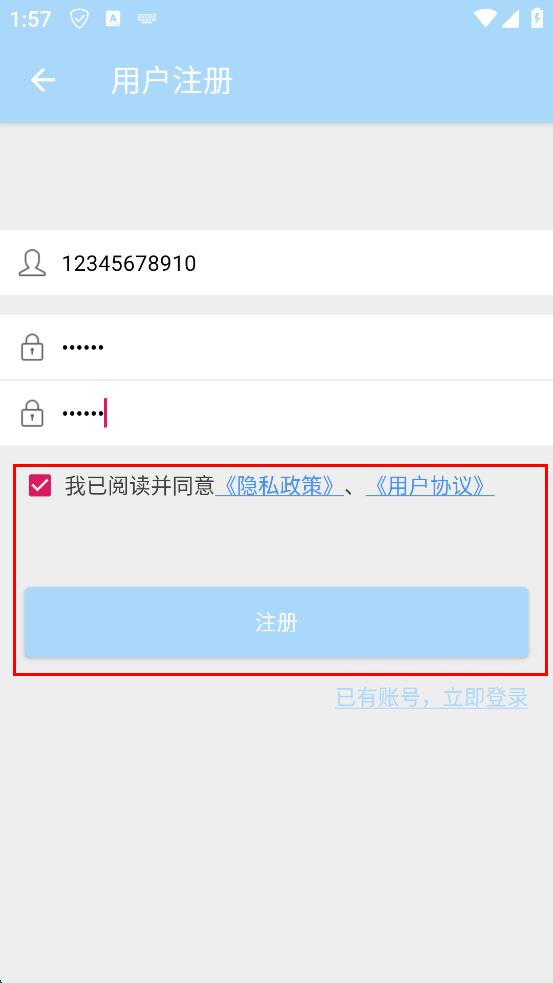 4、勾選我已閱讀并同意隱私政策,用戶協(xié)議,然后點(diǎn)擊下方的“注冊(cè)”按鈕,完成注冊(cè)操作。