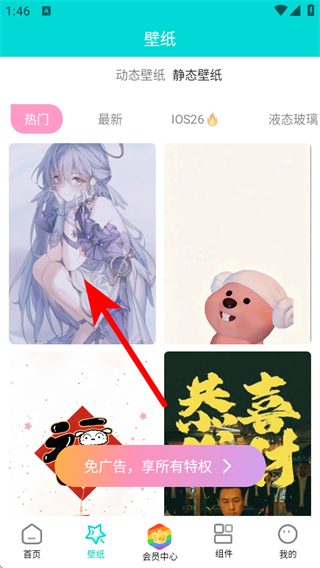 1、在應用首頁,點擊底部壁紙選項,進入壁紙選擇頁面。