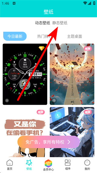 2、在壁紙頁面,點擊靜態(tài)壁紙選項,進入靜態(tài)壁紙列表界面。