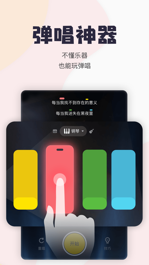 首創(chuàng)彈唱新玩法,不懂樂器也能自彈自唱。在彈唱的基礎上,還可以使用合奏功能添加鼓點/和聲/音效/旋律,為彈唱加點料。