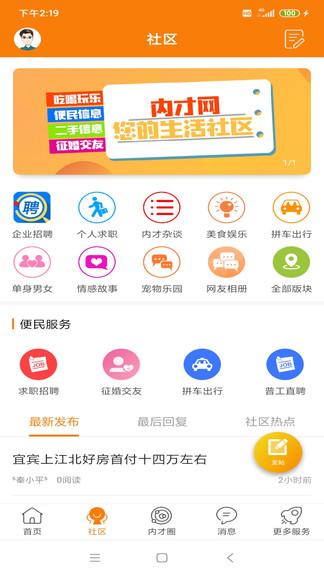 內(nèi)自生活網(wǎng)是生活資訊、人才招聘、社交應(yīng)用內(nèi)才網(wǎng)參與線上線下活動(dòng),內(nèi)才網(wǎng)客戶端是一款社交、互動(dòng)、資訊、服務(wù)一體的移動(dòng)互聯(lián)網(wǎng)應(yīng)用,專注于四川本地生活消費(fèi)(柴米油鹽、吃喝玩樂、衣食住行)和人才招聘服務(wù),是一家四川地區(qū)招聘的互動(dòng)新媒體。