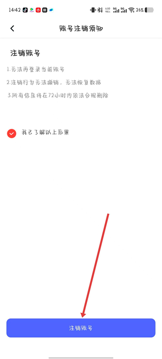 3、在該頁面勾選我已了解以上后果,點擊注銷賬號按鈕。