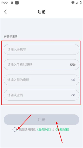 2、填寫手機號、手機驗證碼、設置密碼并確認密碼,勾選服務協(xié)議,點擊注冊。