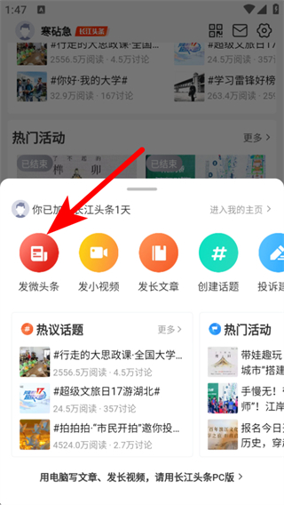 3、在創(chuàng)作功能的選項(xiàng)中,選擇發(fā)微頭條,進(jìn)入內(nèi)容編輯頁面。