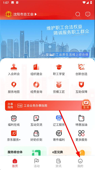 1、打開沈陽e工會app,點擊底部導(dǎo)航欄的我的選項進(jìn)入個人頁面。