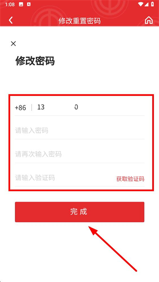 4、在修改密碼頁面,依次輸入新密碼、再次輸入新密碼,獲取并輸入驗證碼,然后點擊完成按鈕完成密碼修改。