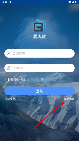 1、打開易人社app,在登錄頁面點擊立即注冊選項,進入實名注冊頁面。