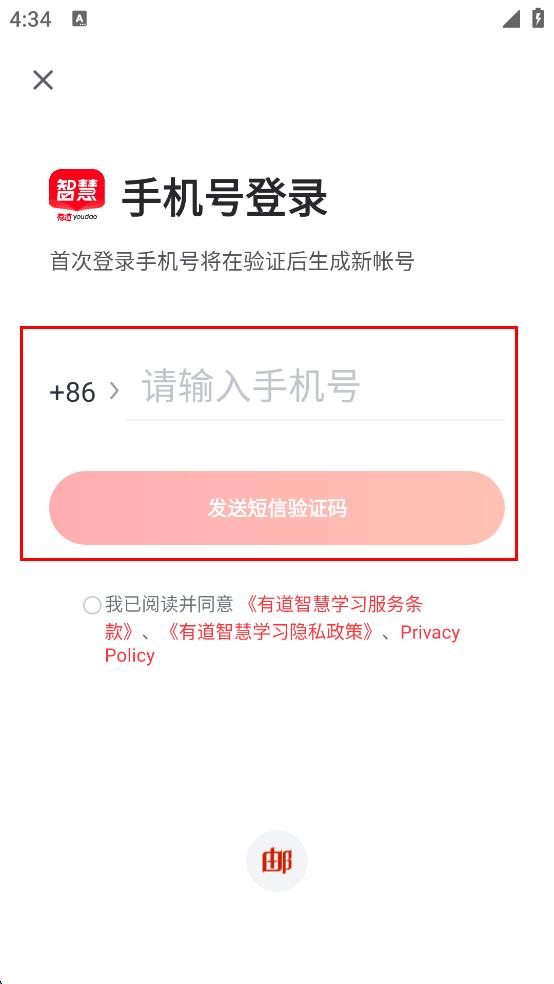 1、打開有道智慧學(xué)習(xí)APP,出現(xiàn)服務(wù)條款與隱私政策界面,仔細閱讀后點擊“同意”,進入主界面。