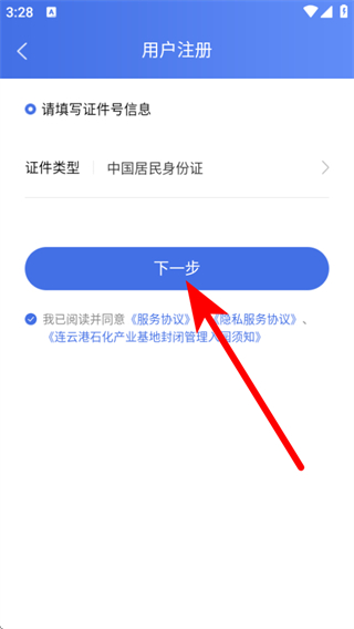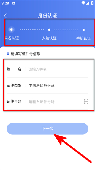 4、在用戶注冊頁面,選擇證件類型后點(diǎn)擊下一步,進(jìn)入身份認(rèn)證頁面。