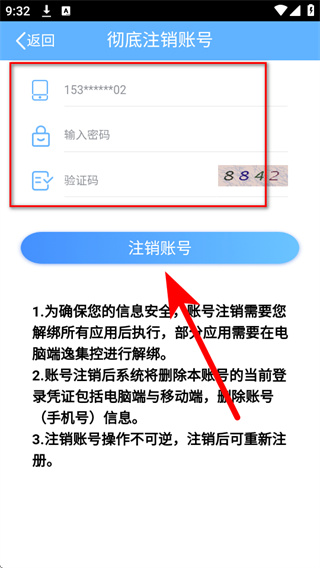 4、在徹底注銷賬號(hào)頁(yè)面,輸入手機(jī)號(hào)、密碼和驗(yàn)證碼后,點(diǎn)擊注銷賬號(hào)按鈕,即可完成賬號(hào)注銷操作。