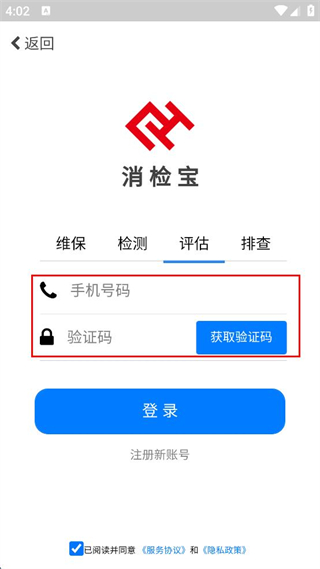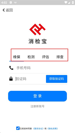2、進(jìn)入手機(jī)號(hào)碼登錄頁(yè)面,選擇維保、檢測(cè)、評(píng)估、排查其中一個(gè)分類。