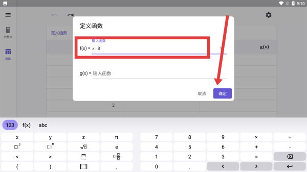 2、在定義函數(shù)窗口的f(x)欄輸入f(x)=x*8,點(diǎn)擊確定按鈕,完成函數(shù)公式的自定義設(shè)置。