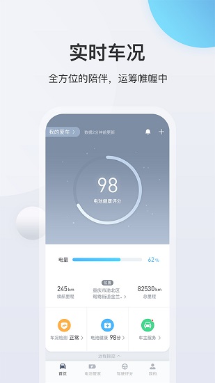 查看愛車的電池健康評分、電池詳情信息和電池使用建議;預(yù)約充電、電池預(yù)約加熱等功能為新能源汽車用戶出行保駕護(hù)航。