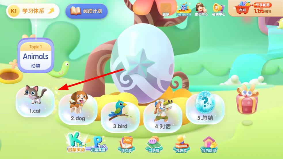 3、在主界面中,找到并點(diǎn)擊之前學(xué)習(xí)的內(nèi)容板塊,比如cat。