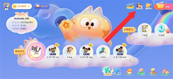 1、點(diǎn)擊界面右上角家長(zhǎng)中心,進(jìn)入家長(zhǎng)驗(yàn)證的環(huán)節(jié)。