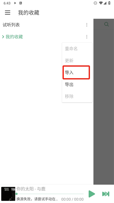 5、點(diǎn)擊這個(gè)三個(gè)點(diǎn)即可看到能夠在收藏出進(jìn)行導(dǎo)入,導(dǎo)入自己喜愛(ài)的各種音樂(lè)或者歌單等。