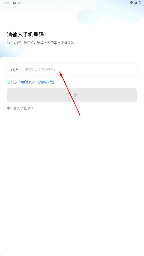 2、在“請輸入手機(jī)號碼”界面,于指定輸入框錄入常用手機(jī)號碼,勾選同意用戶協(xié)議,隱私政策。